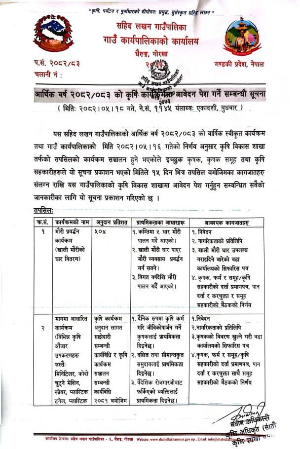 आर्थिक वर्ष २०८२/०८३ को कृषि कार्यक्रममा आवेदन पेश गर्ने सम्बन्धी सूचना।