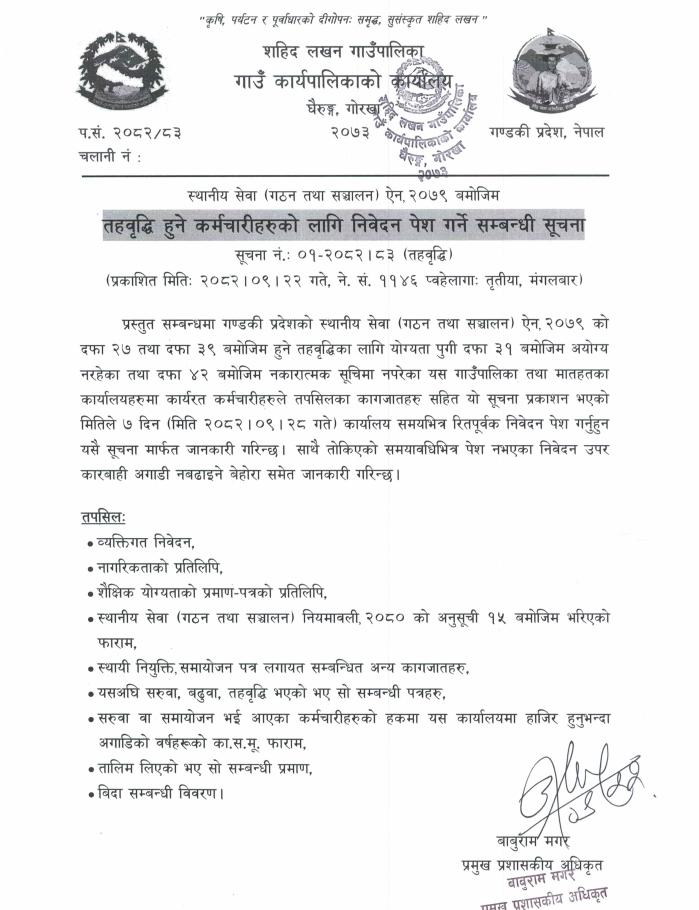तहवृद्धि हुने कर्मचारीहरुको लागि निवेदन पेश गर्ने सम्बन्धी सूचना
