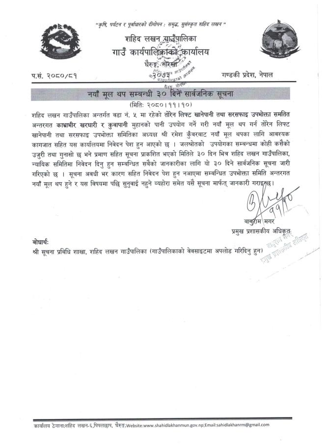 नयाँ मूल सम्बन्धी ३० दिने सार्वजनिक सूचना ।