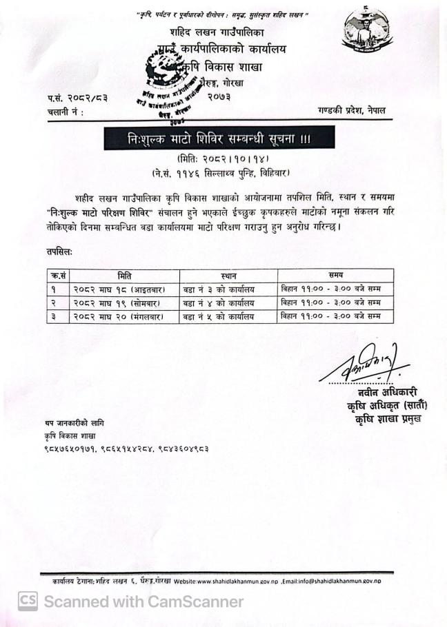 निःशुल्क माटो शिविर सम्बन्धी सूचना।