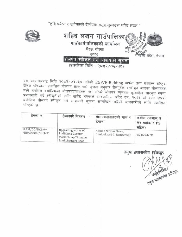 » बोलपत्र स्वीकृत गर्ने आशयको सूचना।