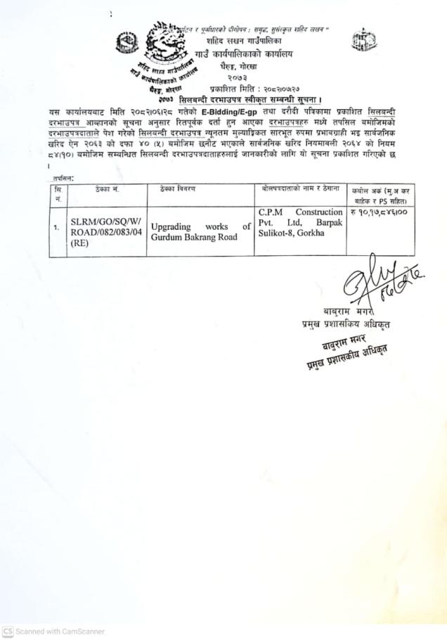 बोलपत्र स्वीकृत गर्ने आशयको सूचना।