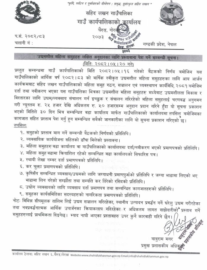 उद्यमशील महिला समुहहरु लक्षित अनुदानका लागि प्रस्तावाना पेश गर्ने सम्बन्धी सूचना ।