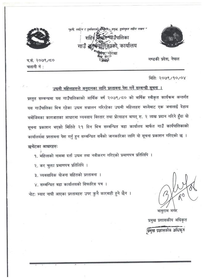 उद्यमी महिलाहरुले अनुदानका लागि प्रस्तावना पेश गर्ने सम्वन्धी सूचना !!
