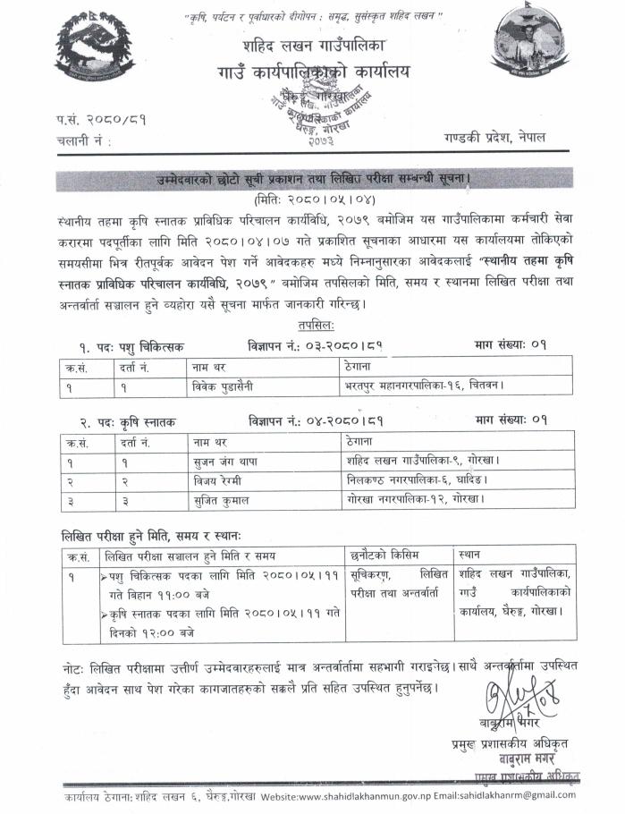 उम्मेदवारको छोटो सूची प्रकाशन तथा लिखित परीक्षा सम्बन्धी सूचना ।
