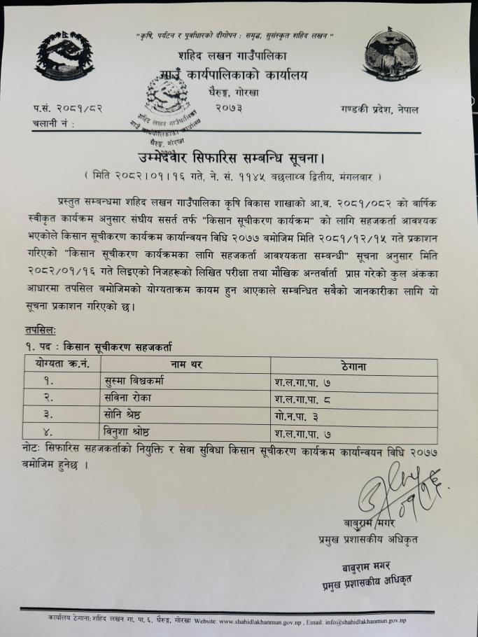 उम्मेदवार सिफारिस सम्बन्धि सूचना।