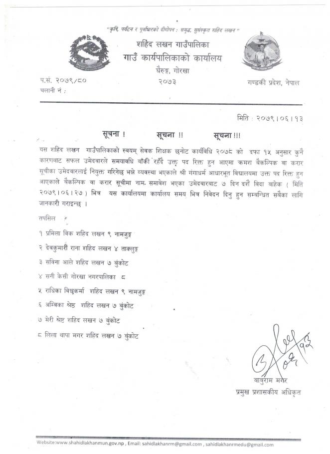 करार सूचीमा रहेका स्वयम् सेवक शिक्षक नियुक्ति सम्बन्धी सूचना