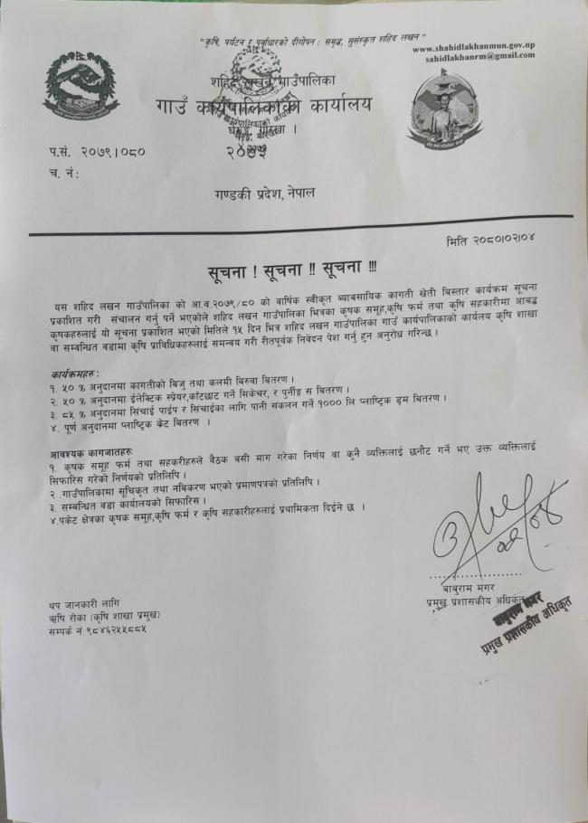 " कृषि, पर्यटन र पूर्वाधारको दिगोपन : समृद्ध, सुसंस्कृत शहिद लखन "