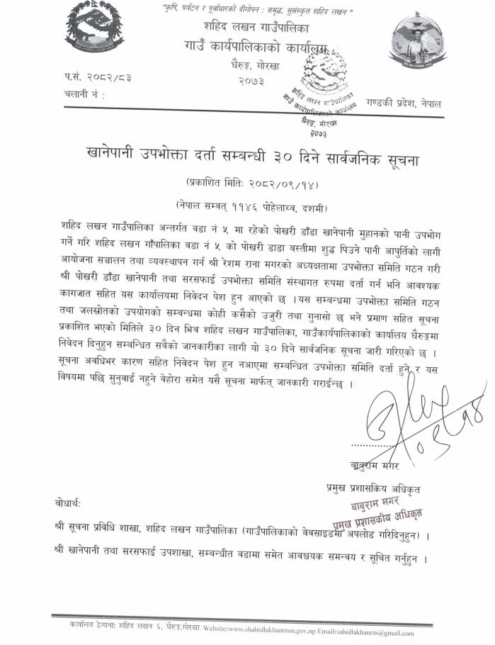 » खानेपानी उपभकोत्ता दर्ता सम्बन्धी ३० दिने सूचना।