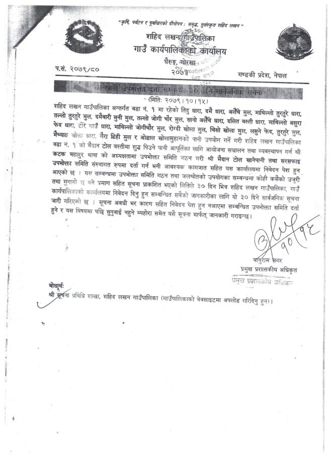 खानेपानी उपभोक्ता दर्ता सम्बन्धी ३० दिने सार्वजनिक सूचना !!