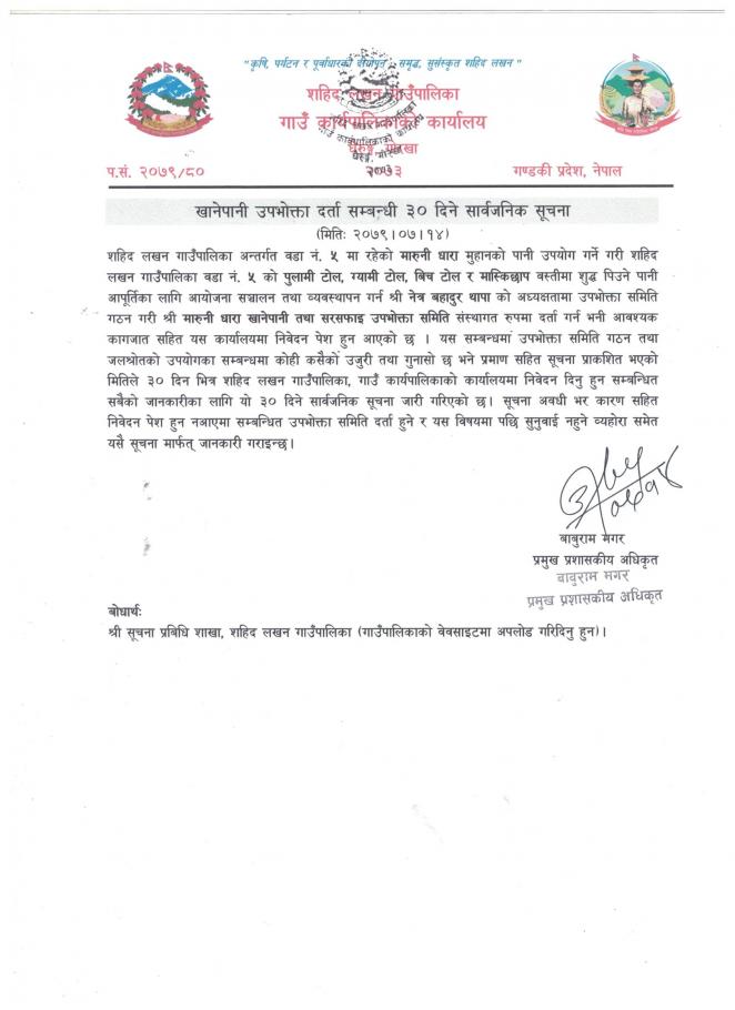 खानेपानी उपभोक्ता दर्ता सम्बन्धी ३० दिने सूचना सार्वजनिक सूचना