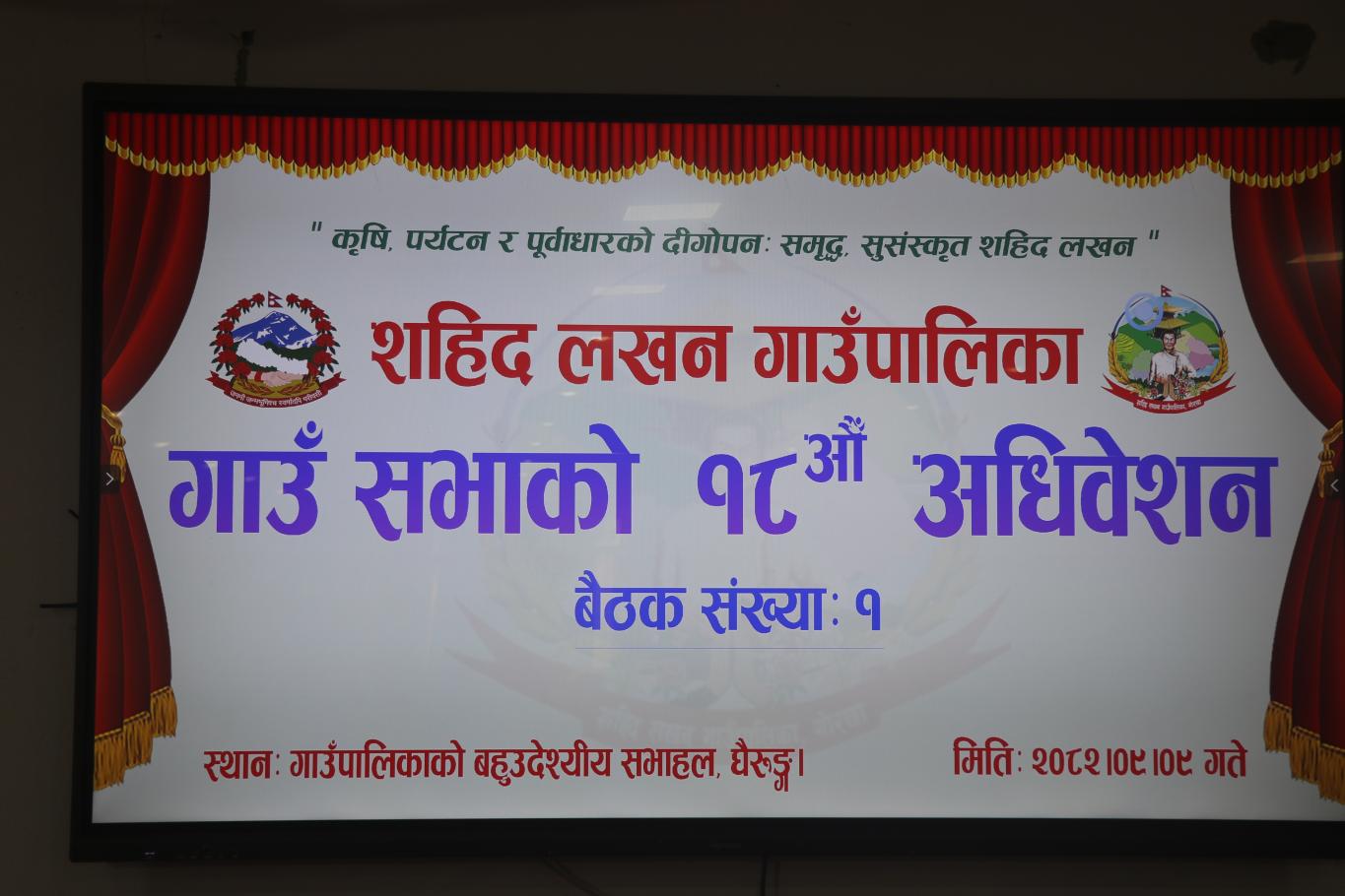 आज मिति २०८२।०९।०९ गते शहिद लखन गाउँपालिकाका अध्यक्ष रमेश बाबु थापा मगरको अध्यक्षतामा गाउँ सभाको १८औँ अधिवेशनको पहिलो बैठक सम्पन्न भएको छ। यस बैठकमा गाउँपालिकाका उपाध्यक्ष, प्रमुख प्रशासकीय अधिकृत, वडाध्यक्षहरू, गाउँ कार्यपालिका सदस्यहरू, न्यायिक समितिका सदस्यहरू, गाउँ सभा सदस्यहरू, विषयगत शाखाका प्रमुखज्यूहरू, कर्मचारीहरू तथा सञ्चारकर्मीहरूको उपस्थिति रहेको थियो।