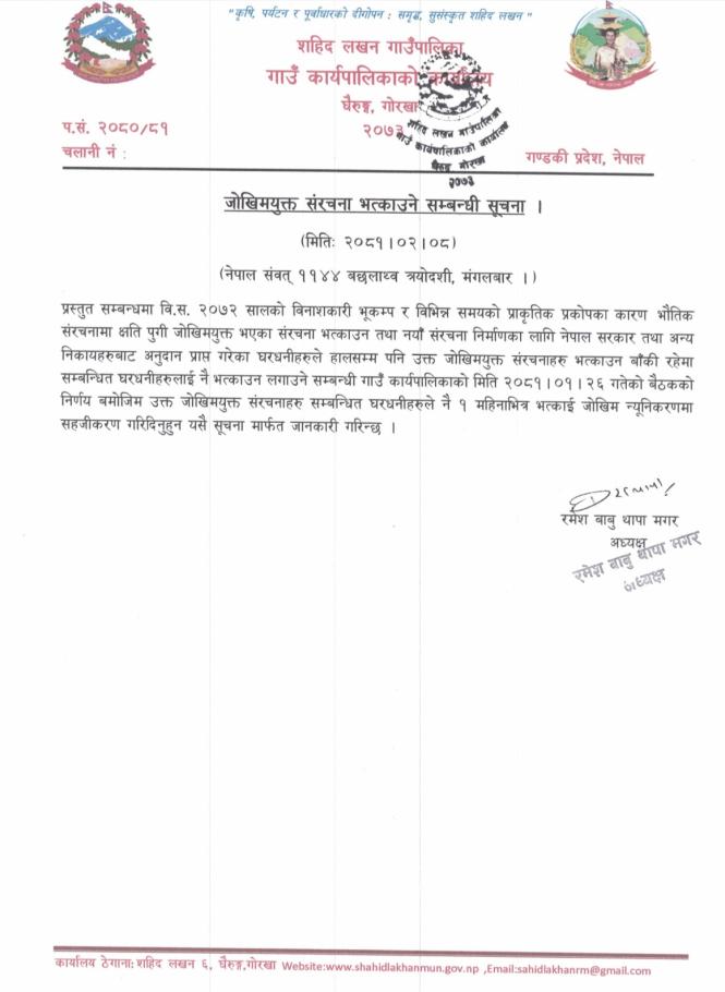 » जोखिमयुक्त संरचना भत्काउने सम्बन्धी सूचना ।