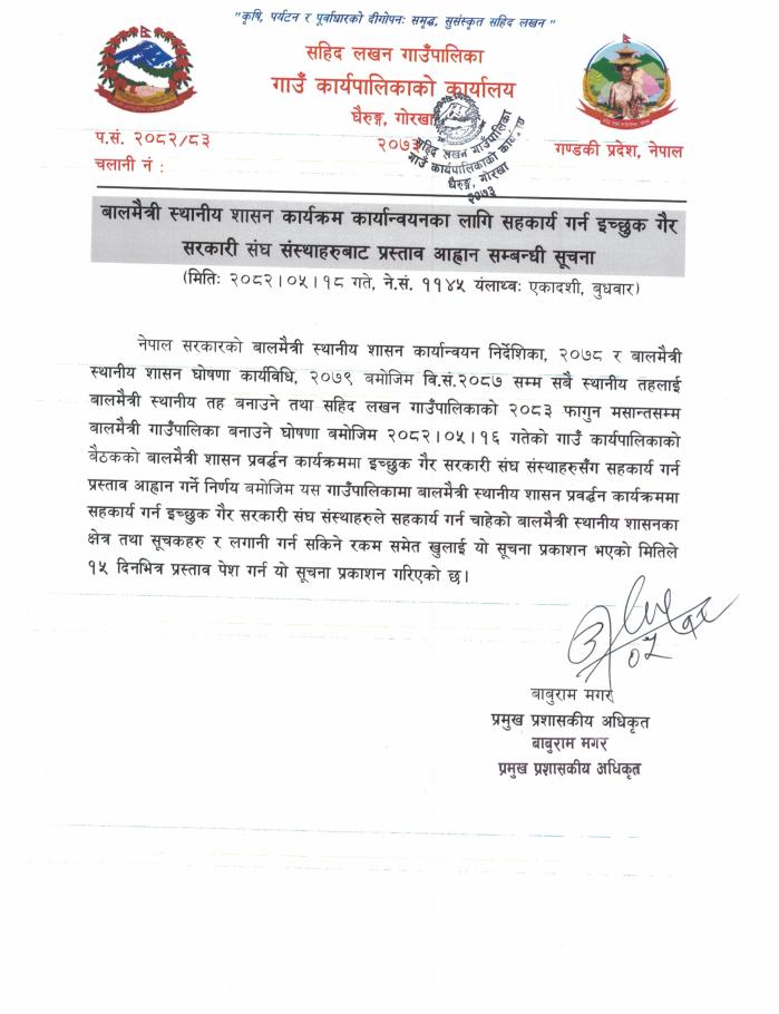 बालमैत्री स्थानीय शासन कार्यक्रम कार्यान्वयनका लागि सहकार्य गर्न इच्छुक गैर सरकारी संघ संस्थाहरुबाट प्रस्ताव आह्वान सम्बन्धी सूचना।
