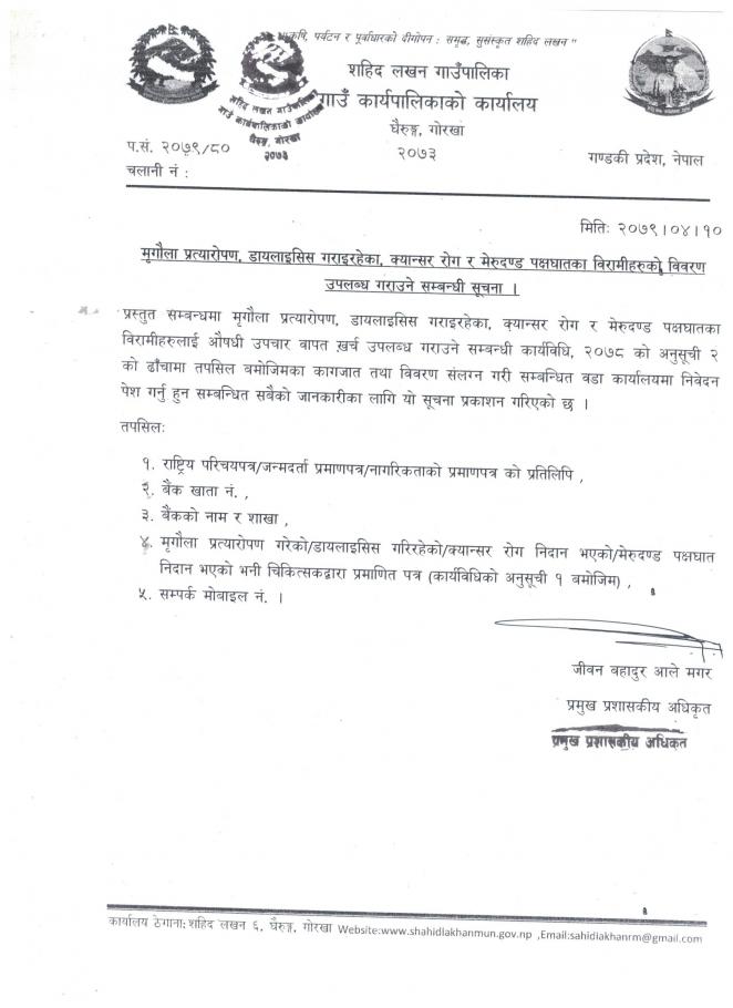 मृगौला प्रत्यारोपण,डायलाइसिस गराइरहेका ,क्यान्सर रोग र मेरुदण्ड पक्षघातका बिरामीहरुको विवरण उपलब्ध गराउने सम्बन्धी सूचना l