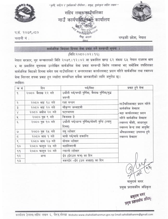सार्वजनिक बिदाका दिन सेवा प्रवाह गर्ने सम्बन्धी सूचना ।
