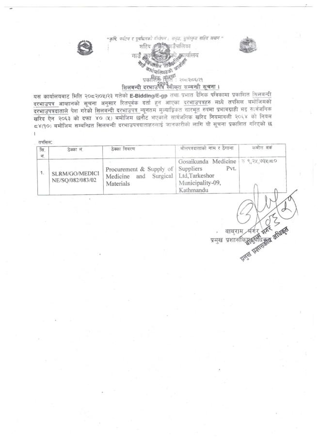 बोलपत्र स्वीकृत गर्ने आशयको सूचना।