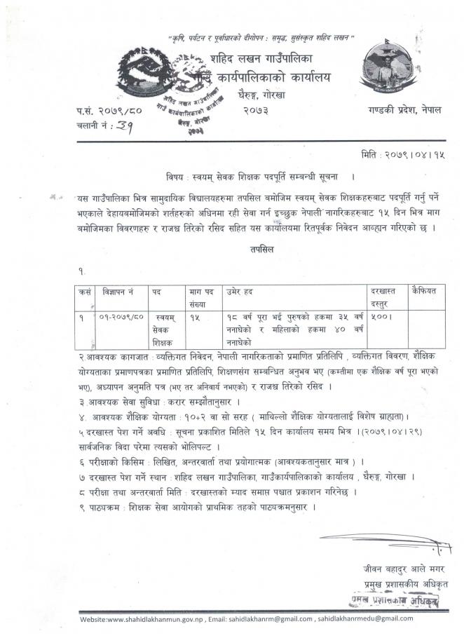 स्वयम् सेवक शिक्षक पदपूर्ति सम्बन्धी सूचना