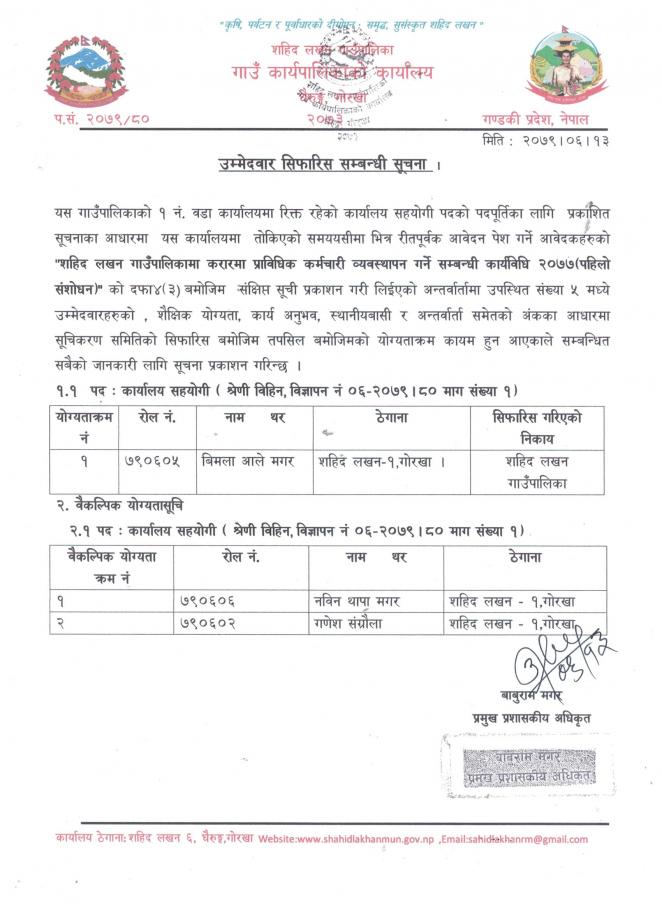 » १ नं. वडा कार्यालयका लागि कार्यालय सहयोगी सिफारिस सम्बन्धी सूचना ।