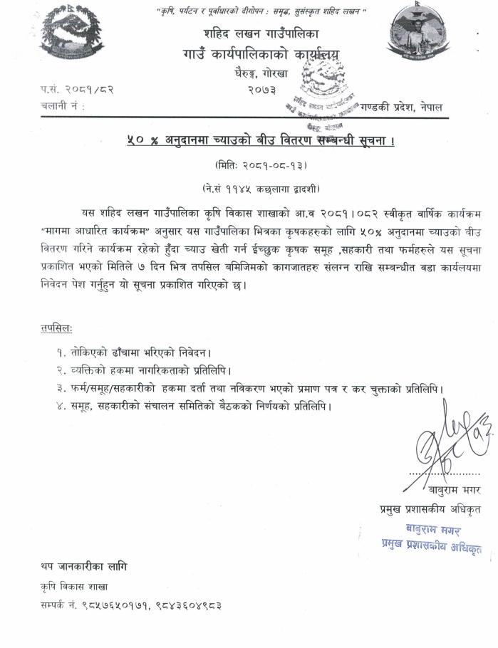 ५०% अनुदानमा च्याउको बीउ वितरण सम्बन्धी सूचना ।