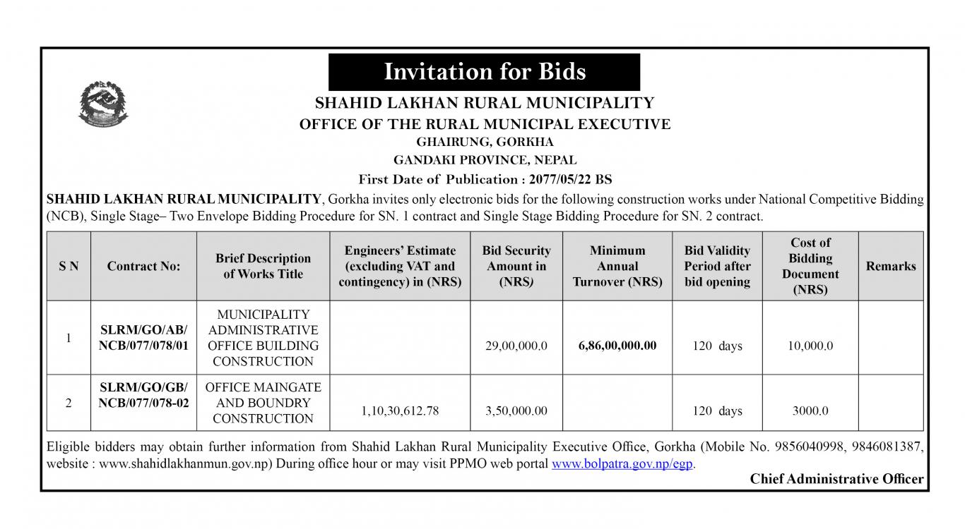 बोलपत्र आह्वान सम्बन्धी सूचना